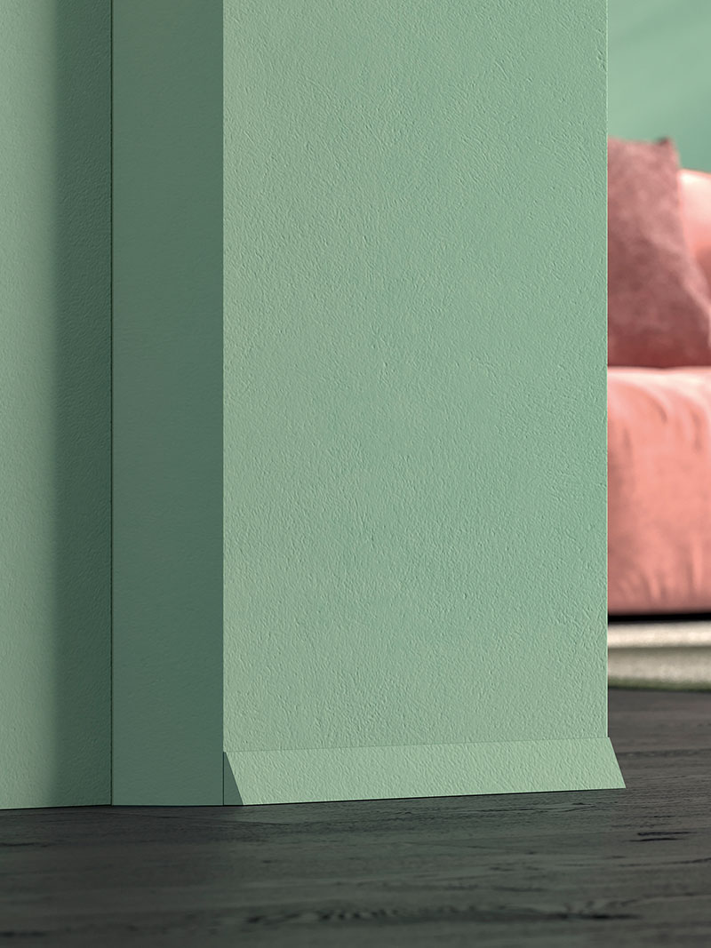 Inoltre questa soluzione non è solo puramente estetica, ma risolve anche il problema del deposito della polvere e permette ai mobili di poggiare direttamente alla parete senza fessurazioni.