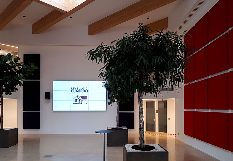 Nel secondo caso studio Eterno Ivica è intervenuta migliorando l’acustica della hall principale dell’azienda Gruppo Triveneta di Veggiano; qui sono stati installati 32 pannelli Phonolook Solution di colore rosso con cornice in legno e affissi tramite kit a calamita, ricoprendo un’intera parete.