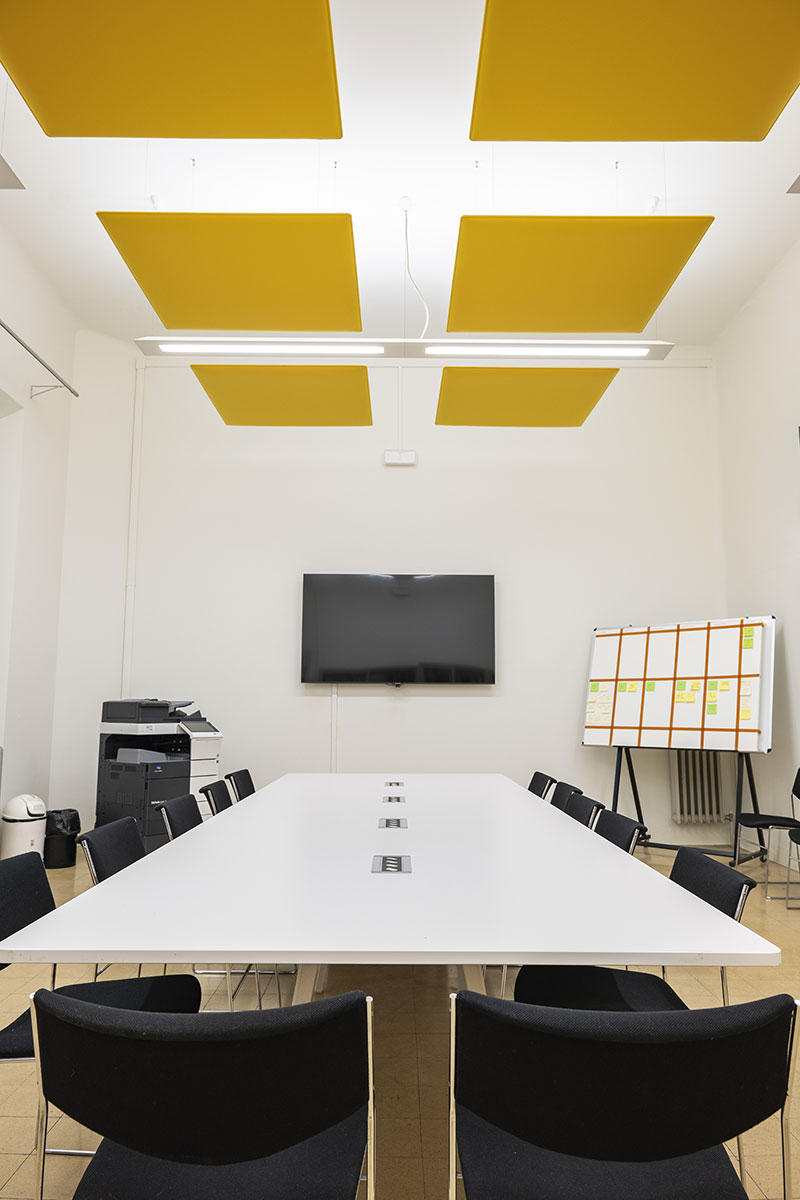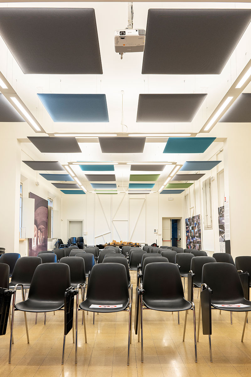 Il comfort acustico dello spazio è stato migliorato grazie alle caratteristiche di questi pannelli che permettono un ottimo assorbimento alle frequenze medio-alte, Classe A di assorbimento acustico secondo UNI EN ISO 11654.