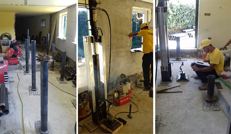 I micropali sono stati realizzati all’interno della zona abitabile (operando in zone anche con altezza ridotta), previo carotaggio della platea, e disposti su due file, a quinconce.