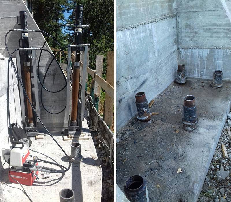 È stata poi realizzata dall’impresa una struttura di sostegno in c.a., con parametro accostato ai gabbioni e alla parete muraria, con fondazione impostata su due file di micropali pressoinfissi SYStab. Data la mancanza di spazi adeguati, i micropali sono stati realizzati anche in questo caso con la tecnologia dei pali precaricati con martinetti idraulici, unica a non necessitare di macchinari ingombranti per la messa in opera. La fondazione del muro è stata incassata sotto i gabbioni per circa 30-40 centimetri, ed il muro è stato realizzato per fasi, costruendo prima la fondazione, usata poi come contrasto per l’infissione di 32 micropali diametro 114 mm, lunghezza media 10 metri e spessore 10mm, e successivamente l’elevazione del muro, provvisto anche di contrafforti.