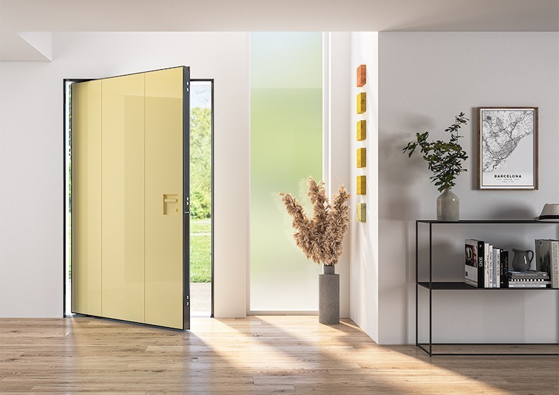 Proseguendo il percorso di ampliamento della propria collezione di alta gamma – inaugurato nel 2016 con il primo modello pivotante e proseguito nel 2021 con la porta a filomuro interno – Di.Bi. propone Di.Big: una porta blindata ad anta unica, con apertura a bilico e filo telaio.