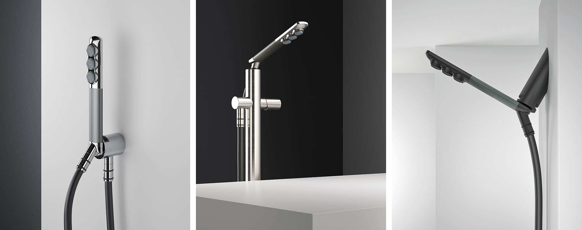 Diverse le soluzioni disponibili date dalla linearità del design. Dal consueto set doccetta, dotato di presa acqua a muro e supporto, se abbinata al suo braccio doccia a muro dedicato è fruibile anche come un soffione doccia. Se abbinata al gruppo doccia o vasca esterno, sempre con l’ausilio del suo braccio apposito, può fungere sia da doccetta che da soffione. Se inserita nella colonna vasca da terra la doccetta assolve alla duplice funzione di getto vasca e, se estratta dal suo supporto, di doccetta a mano.