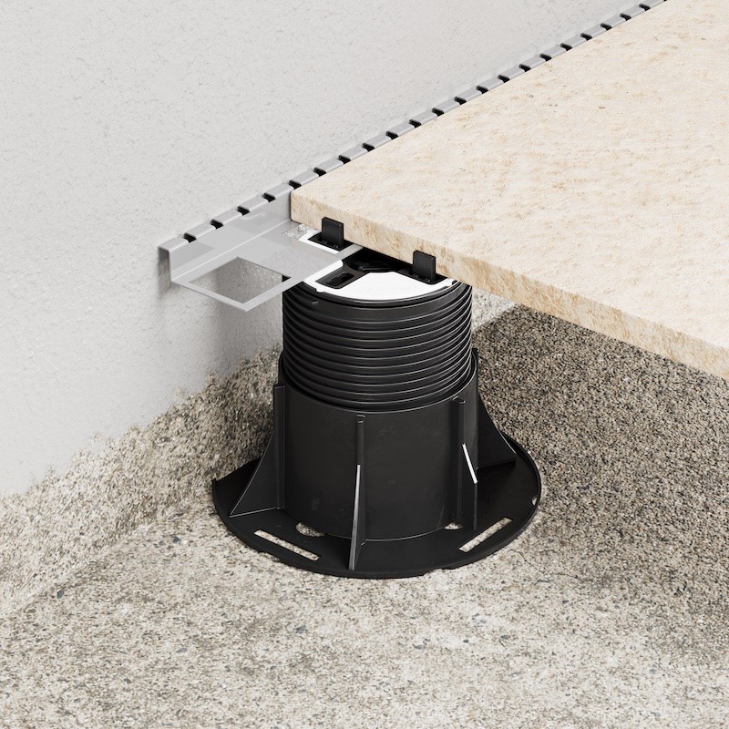 Il profilo distanziatore perimetrale, realizzato in alluminio, è pensato come elemento di finitura per bordature perimetrali di pavimenti sopraelevati in corrispondenza di pareti. Questo profilo crea una fuga di 1 o 2 cm tra pavimento e parete, consentendo l’assestamento delle lastre; inoltre la sua conformazione permette l’appoggio su membrane verticali senza comprometterne la tenuta mediante ancoraggi invasivi, poggia su più supporti contemporaneamente ed è compatibile con lastre da 20 mm di spessore.