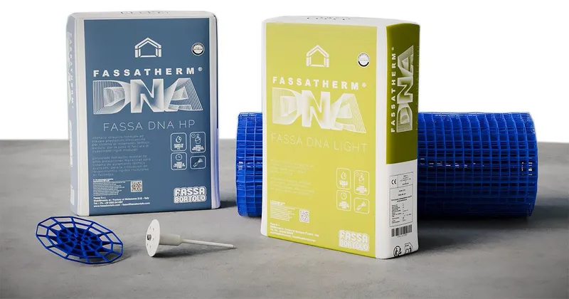 Punto di forza di Fassatherm®DNA sono due nuovi intonaci nati specificatamente per questa soluzione: Fassa DNA HP è un intonaco idraulico minerale a elevate prestazioni meccaniche per la posa in facciata di rivestimenti rigidi modulari, come piastrelle di grés porcellanato e lastre di pietra, mentre Fassa DNA Light è un intonaco idraulico alleggerito adatto a esaltare e proteggere effetti decorativi e all’utilizzo di toni saturi, anche i colori scuri normalmente sconsigliati quando si parla di cappotto termico.
