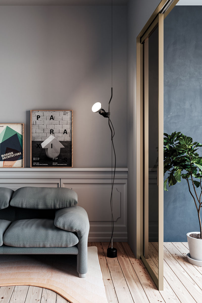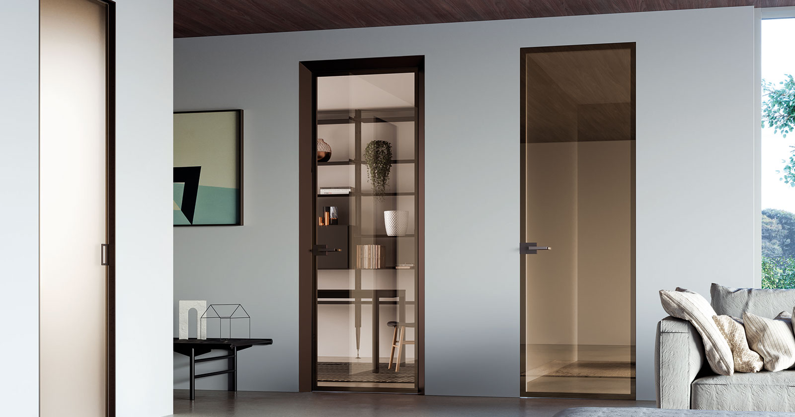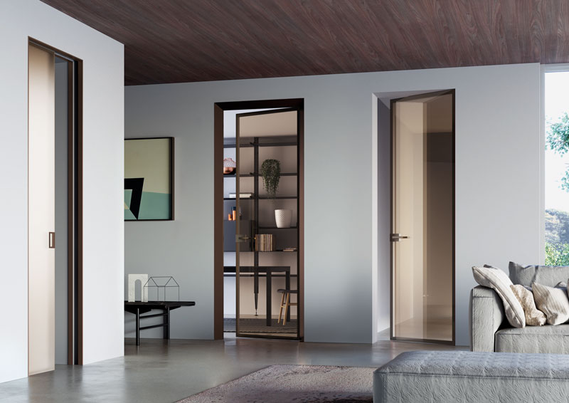 L’esigenza nasce dal fatto che le porte di ECLISSE 40 Collection sono disegnate con un telaio strombato di 40° da una parte e filo muro dall’altra; pertanto la strombatura del telaio è un elemento decorativo piuttosto rappresentativo che è corretto equilibrare con i profili in alluminio anodizzato ECLISSE Mimesi.