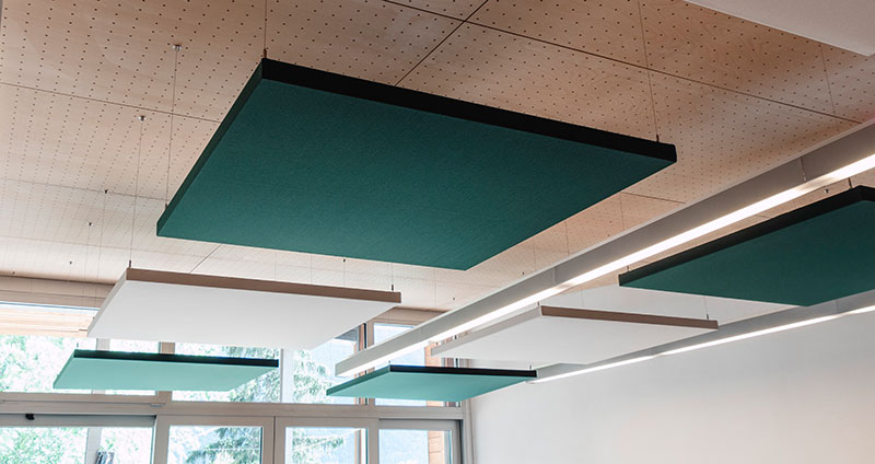 L’installazione dei dispositivi fonoassorbenti ha richiesto una sola settimana di lavoro; sono infatti progettati per tempi di posa contenuti, adattabilità ad ambienti esistenti e non necessitano di manodopera specializzata per la posa. La semplicità del montaggio dei pannelli è dunque un ulteriore aspetto positivo, accompagnato dalla flessibilità delle tipologie di ancoraggio proposte: in questo caso specifico i pannelli sono stati ancorati ai controsoffitti preesistenti mediante cavetti in acciaio. L’applicazione a soffitto è stata scelta rispetto a quella a parete per lasciare libere le superfici orizzontali; mentre l’applicazione a sospensione è stata preferita al fissaggio in aderenza per aumentare il fonoassorbimento dei pannelli nelle basse frequenze grazie all’intercapedine, aumentando ulteriormente la qualità della riduzione del riverbero e di conseguenza il comfort acustico interno.