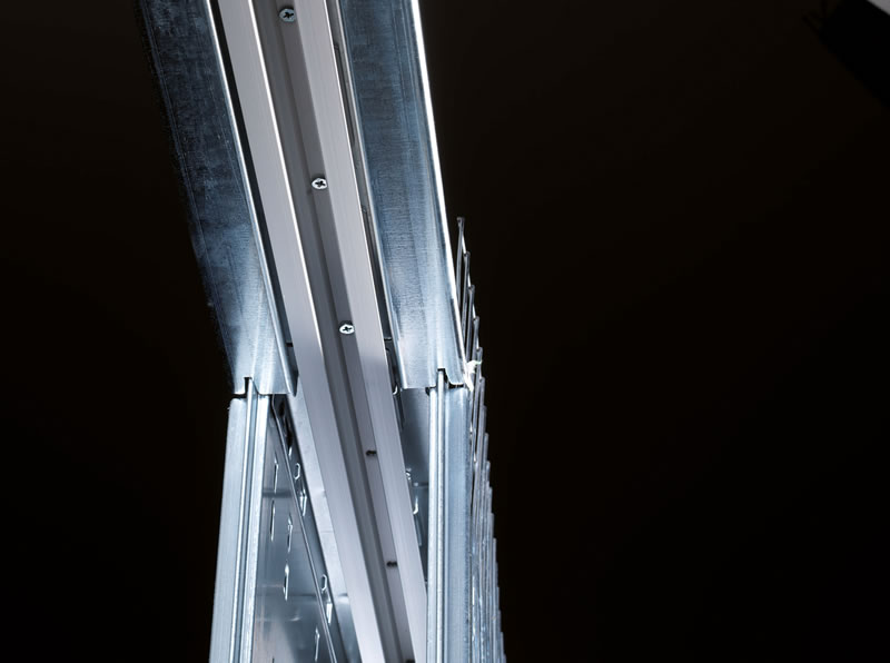 La robustezza della struttura a scomparsa, provata da brevetti e test specialistici, è garantita dalle 12 traversine di rinforzo sagomate a coda di rondine, che non flettono quando si fissa la lastra di cartongesso, preservando l’integrità della sede interna del controtelaio.