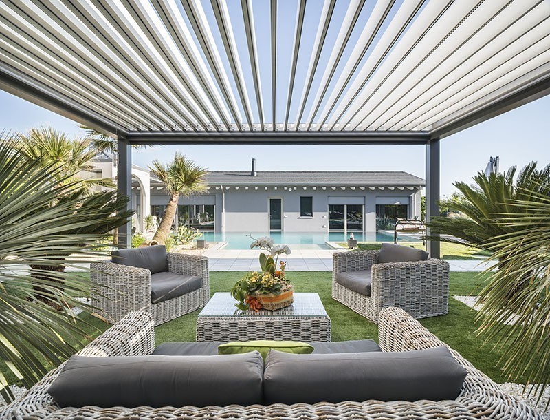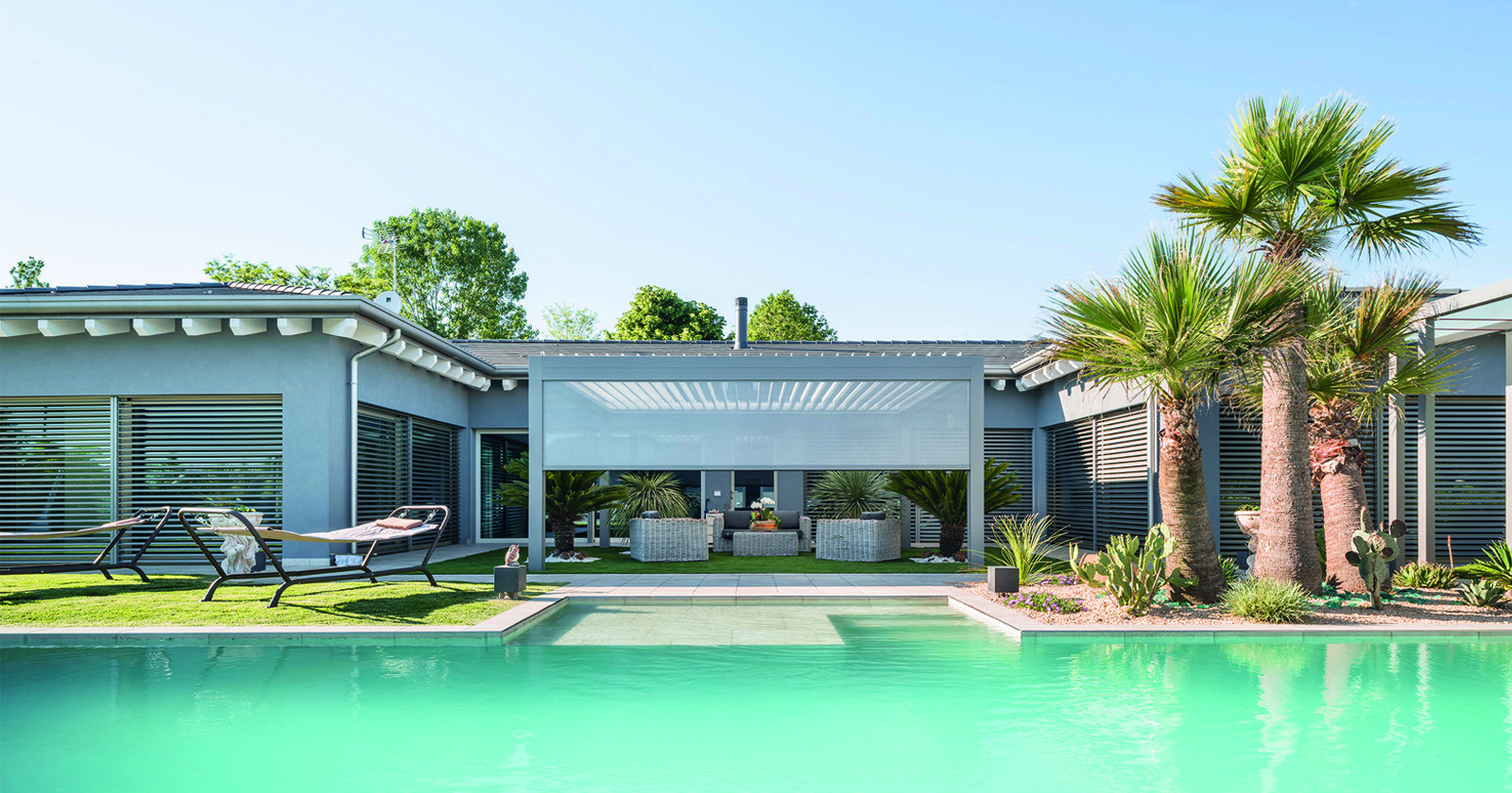 Nella zona esterna, il desiderio della committenza era quello di godersi al massimo il giardino e l’area della piscina. Per questo è stata installata una pergola bioclimatica Gibus Varia, equipaggiata con una tenda a caduta integrata sul fronte, lato più esposto al sole; è inoltre dotata di un avanzato sistema di illuminazione LED RGB perimetrale, settato sui toni del blu per richiamare i colori della piscina. La pergola Varia, come le schermature utilizzate all’interno, ha un design minimale e contemporaneo che si inserisce armoniosamente nel concept progettuale dell’abitazione, anche grazie alla scelta cromatica: un grigio opaco sia per la struttura della pergola che per i tessuti delle tende Click Zip.