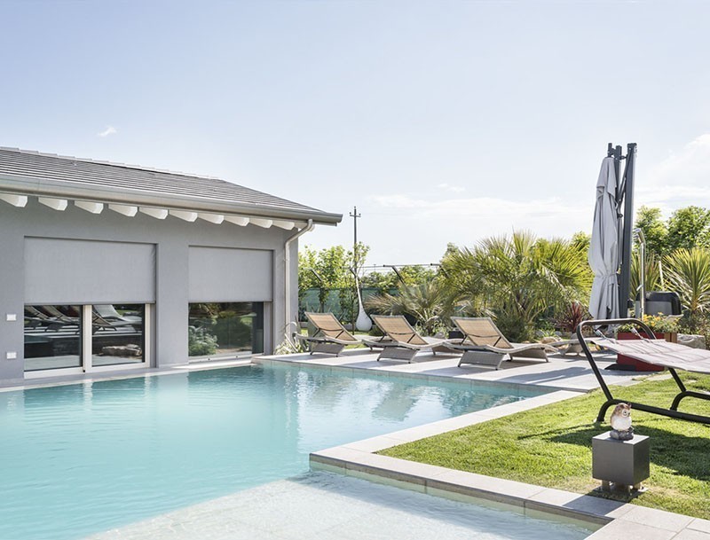 Qui l’esigenza della committenza era di trovare un’alternativa ai frangisole a lamelle, utilizzati nel resto dell’abitazione, per le ampie vetrate degli spazi destinati al wellness, accolti in un padiglione realizzato nel giardino che circonda l’abitazione.
