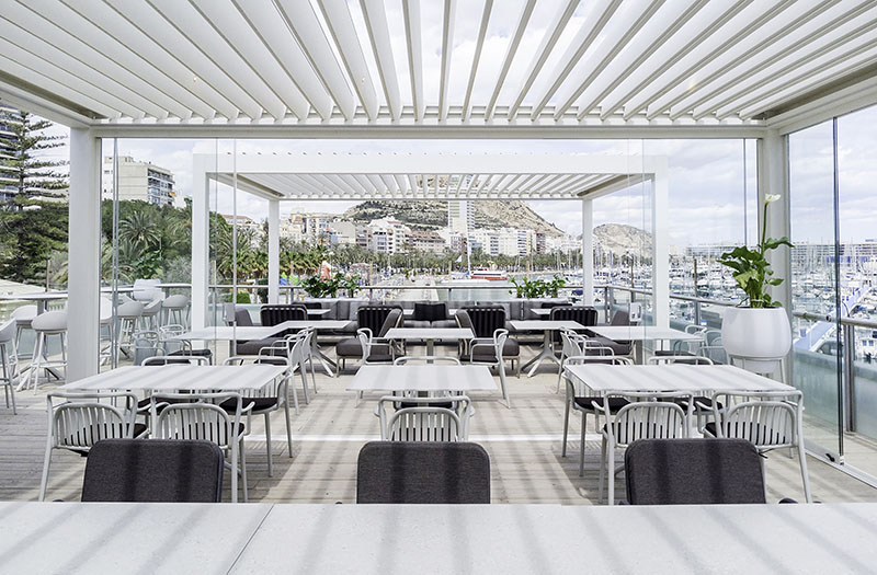 Il ristorante Monastrell ad Alicante necessitava di un nuovo ambiente sul mare per avere la possibilità di accogliere un maggiore numero di clienti sia per il pranzo sia per la cena, e con qualsiasi condizione metereologica.