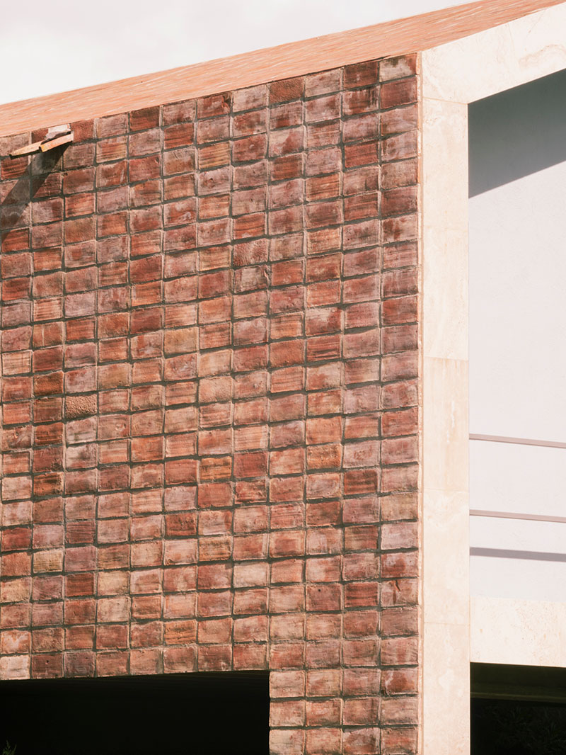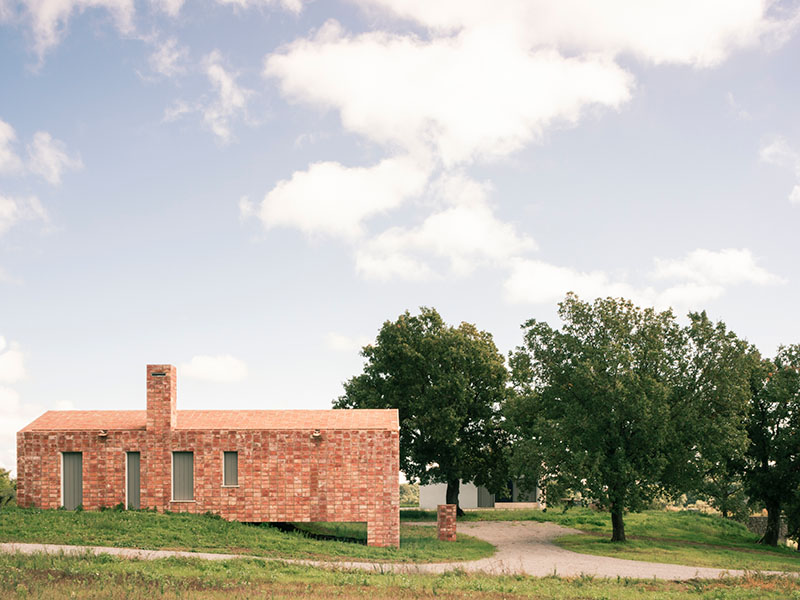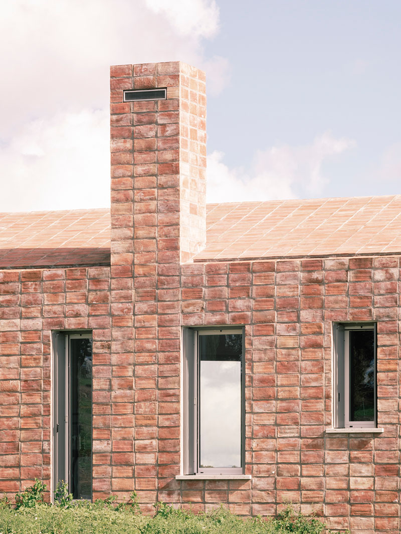 L’edifico minore, invece, destinato prevalentemente agli ospiti, è caratterizzato da un rivestimento continuo in pianelle di laterizio stampate a mano / cotto di recupero: una superficie esterna unica che include anche la parte del tetto a falde e l’impluvio, incassando le gronde di raccolta delle acque meteoriche, inserite all’interno nello spessore del solaio di copertura. Dotata di un portico sul fronte di ingresso – ottenuto sollevando una parte della tamponatura di uno dei lati lunghi come fosse un portellone – anche in questa casa, ortogonale alla prima, gli interni sono caratterizzati da passaggi minimi, spazi raccolti e angoli che si susseguono in una dialettica tra interno ed esterno: la cucina è posta a nord, a schermare dai venti di tramontana un soggiorno passante, la zona notte a sud.