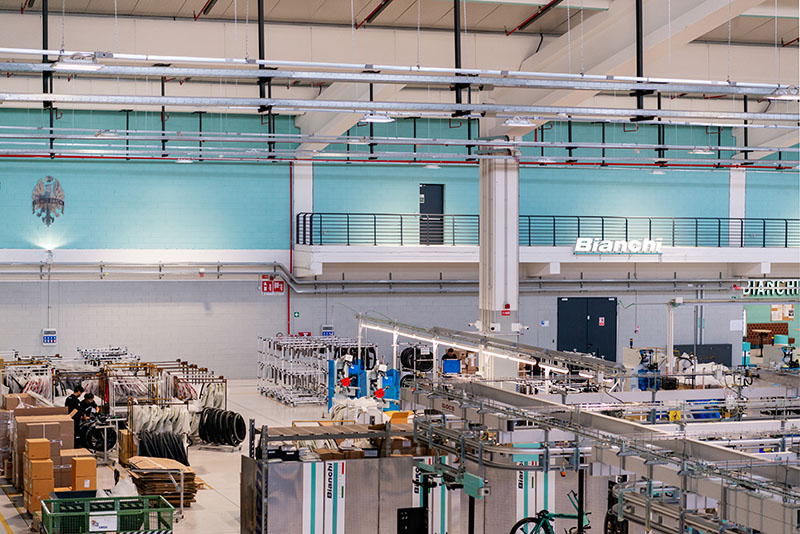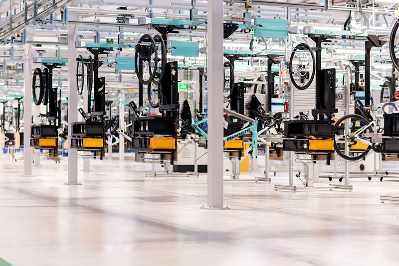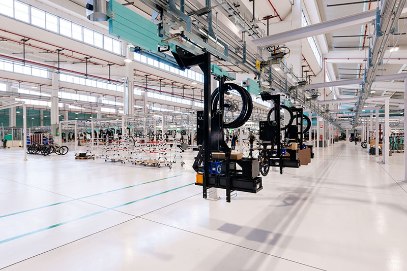 L’ambiente produttivo è organizzato in sei aree – carico bilancelle, assemblaggio manubri, pre-montaggio, montaggio, controllo qualità e imballo – progettate in modo lineare e ad alto contenuto tecnologico con attrezzature sospese, al fine di garantire efficienza operativa e sicurezza.