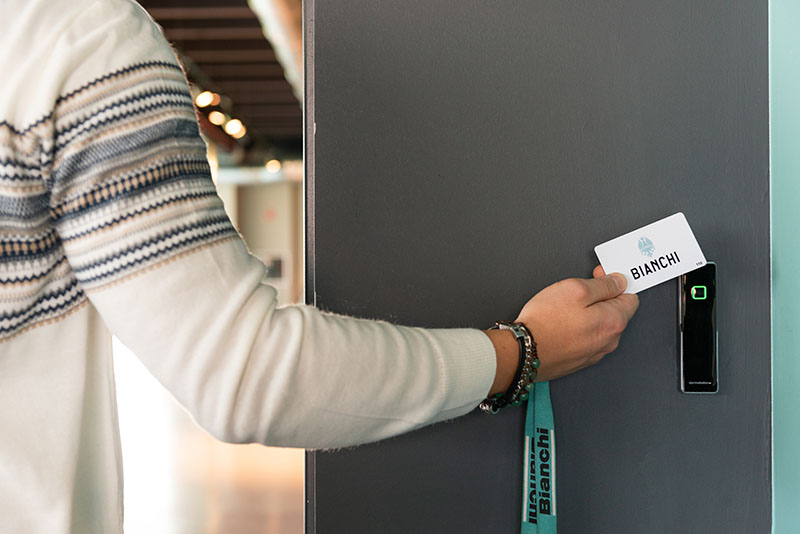 Organizzato in sei aree produttive con attrezzature sospese ad alto contenuto tecnologico, la nuova sede Bianchi accoglie al suo interno anche un museo, con i modelli iconici dell’azienda e le biciclette di ultima generazione, e lo showroom. Per il controllo costante degli accessi, delle presenze per settore produttivo e per usufruire dei servizi aziendali, dormakaba offre un servizio integrato con software, terminali, lettori, badge e tornelli.