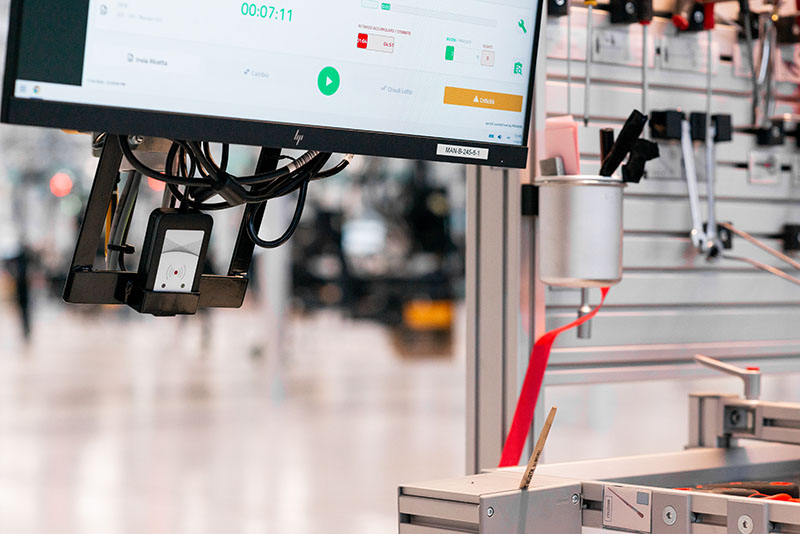 La fabbrica include postazioni di lavoro ergonomiche dotate di touchscreen e lettori di identificazione che permettono di analizzare le competenze operative, ottimizzare i processi e pianificare la formazione continua dei dipendenti.