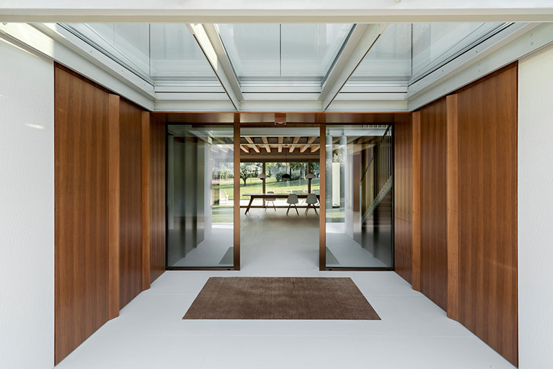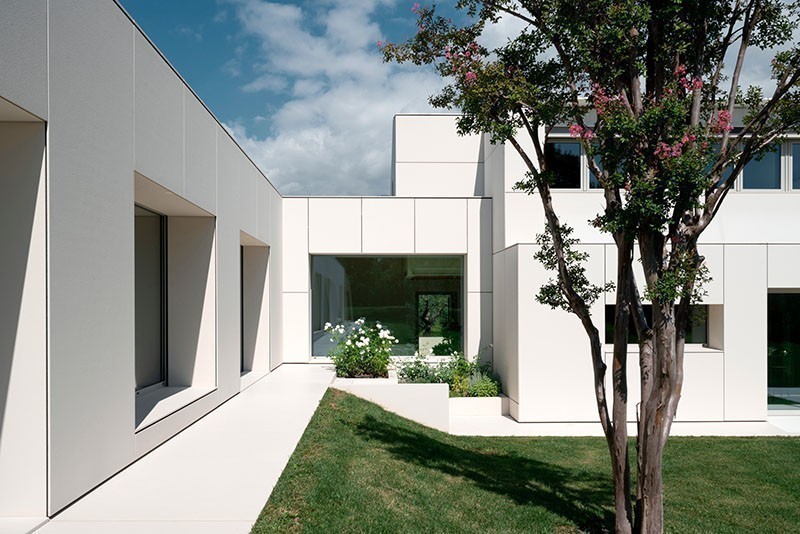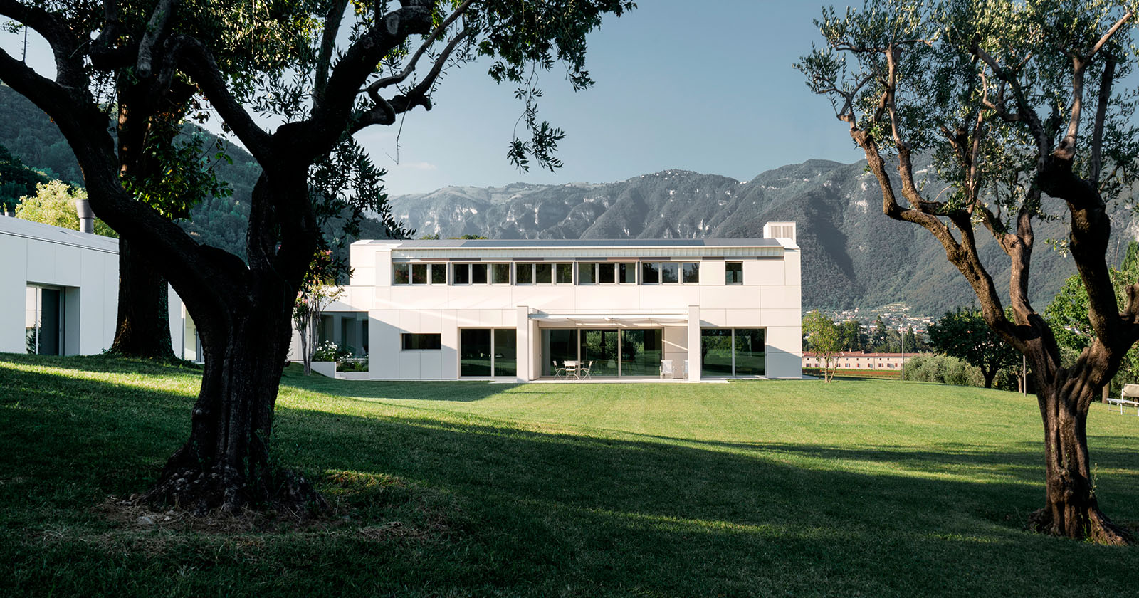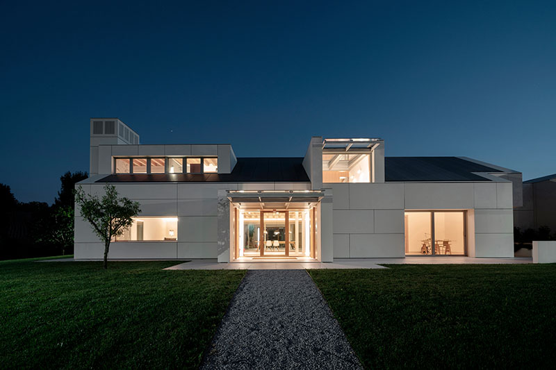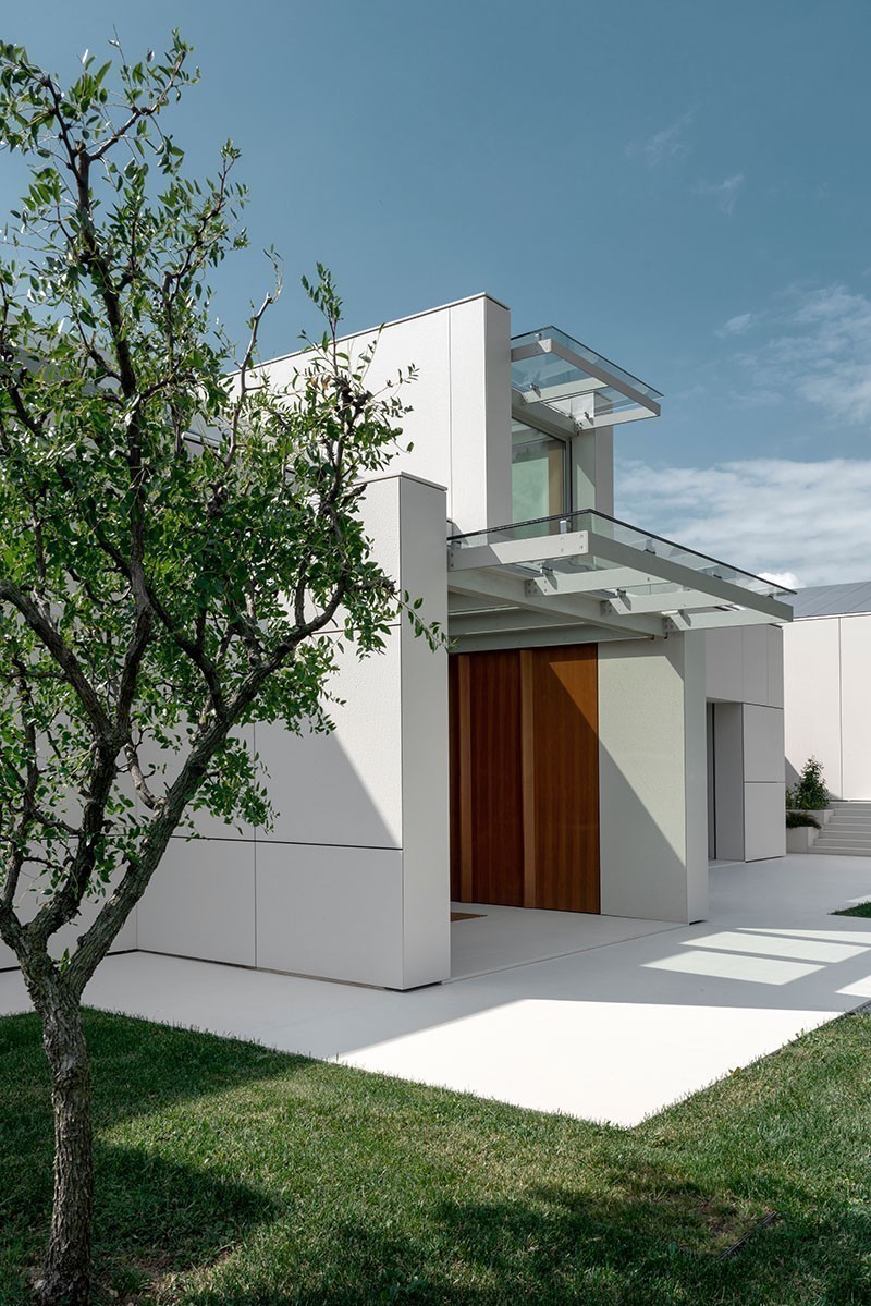 La nuova architettura residenziale interpreta in chiave contemporanea i dettami del linguaggio palladiano, secondo le intenzioni del progettista. Il corpo principale, di due piani fuori terra, si estende con un’ala di un singolo piano verso l’interno assecondando le curve naturali del terreno. I volumi sono puri e le geometrie rigorose, scanditi da un preciso rapporto di pieni e vuoti; l’ingresso definito da una lunga copertura di vetro.