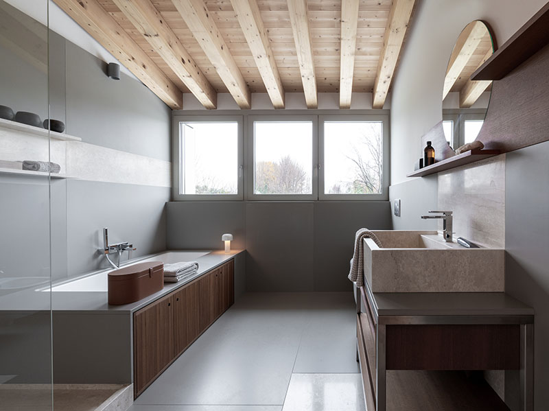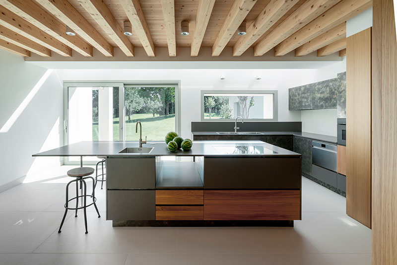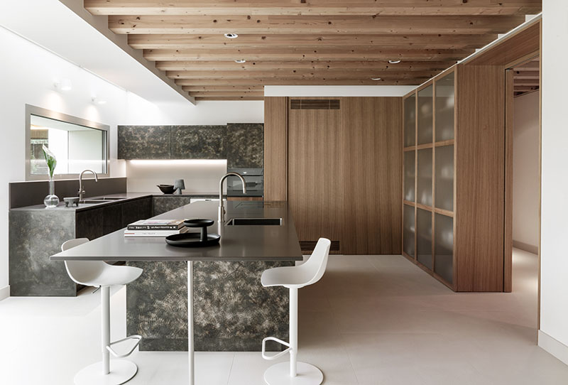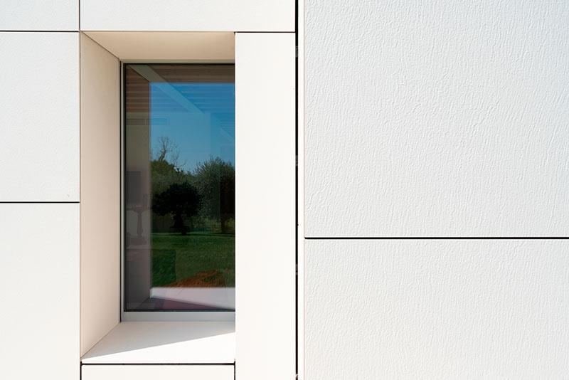 A stabilire il ritmo dei pieni e dei vuoti è stata la scelta delle lastre Lapitec come unico rivestimento: sono infatti in pietra sinterizzata le superfici orizzontali, verticali e anche la copertura.