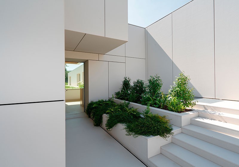 Le pavimentazioni delle zone all’esterno, arricchite da fioriere e sviluppate lungo l’intero perimetro dell’abitazione, sono sempre in Lapitec, finitura Bianco Polare.