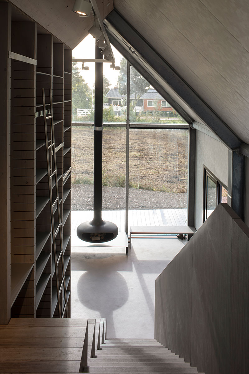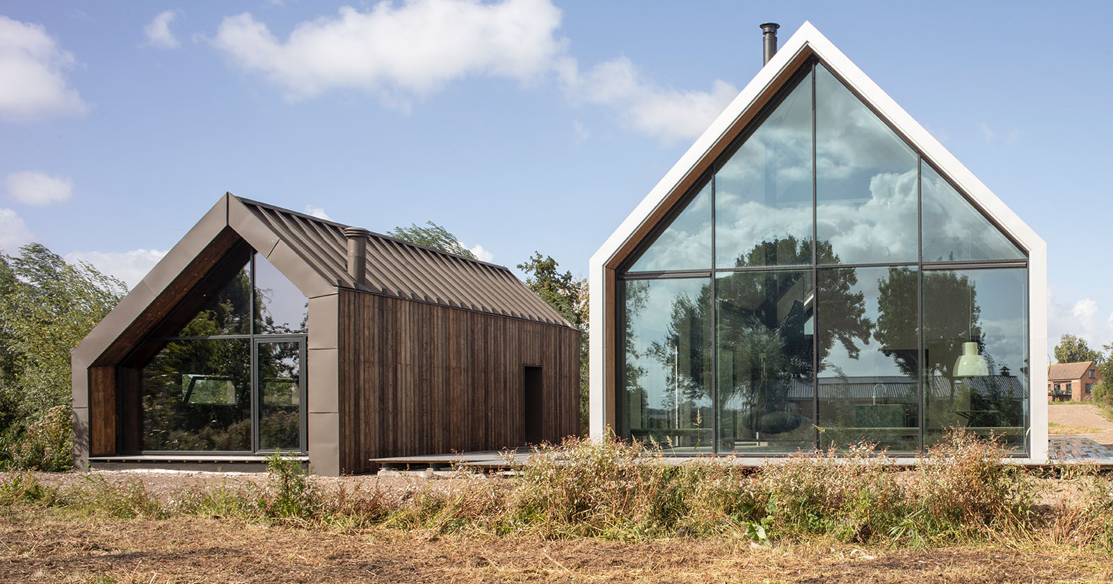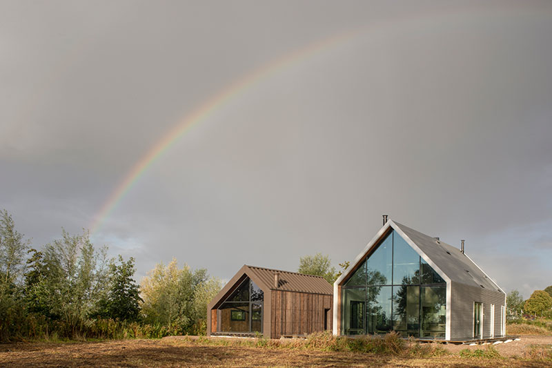 Il lotto di Amstelhoek è stato selezionato dopo un’attenta ricerca tra i pochi lotti edificabili vicino alla città di Amsterdam. Il suo terreno è posto al di sotto della quota del fiume e, nonostante il livello dell’acqua di falda sia costantemente controllato da un sistema di idrovore, gran parte della sua superficie è calpestabile con difficoltà nei piovosi mesi invernali. Per questo motivo, è stata prevista la costruzione di due edifici sinergici dal punto di vista funzionale e impiantistico: due volumi uniti da un deck sospeso e collegato, attraverso una lunga passerella pedonale, al molo per imbarcazioni sull’argine del fiume. Un’abitazione principale e una dependance di circa 50 m2, dotata di bagno, di piccola cucina a scomparsa e di soppalco, pensata come un cono prospettico aperto verso il paesaggio.