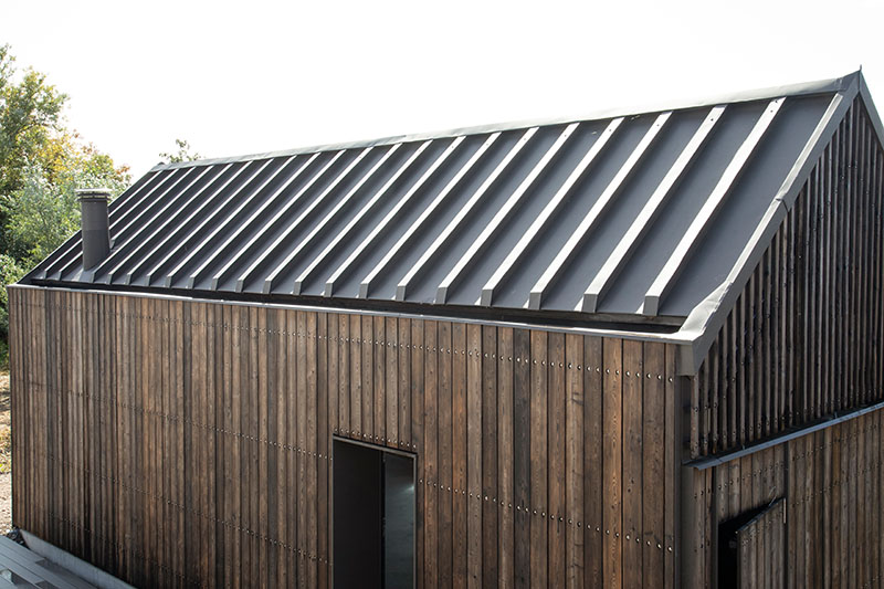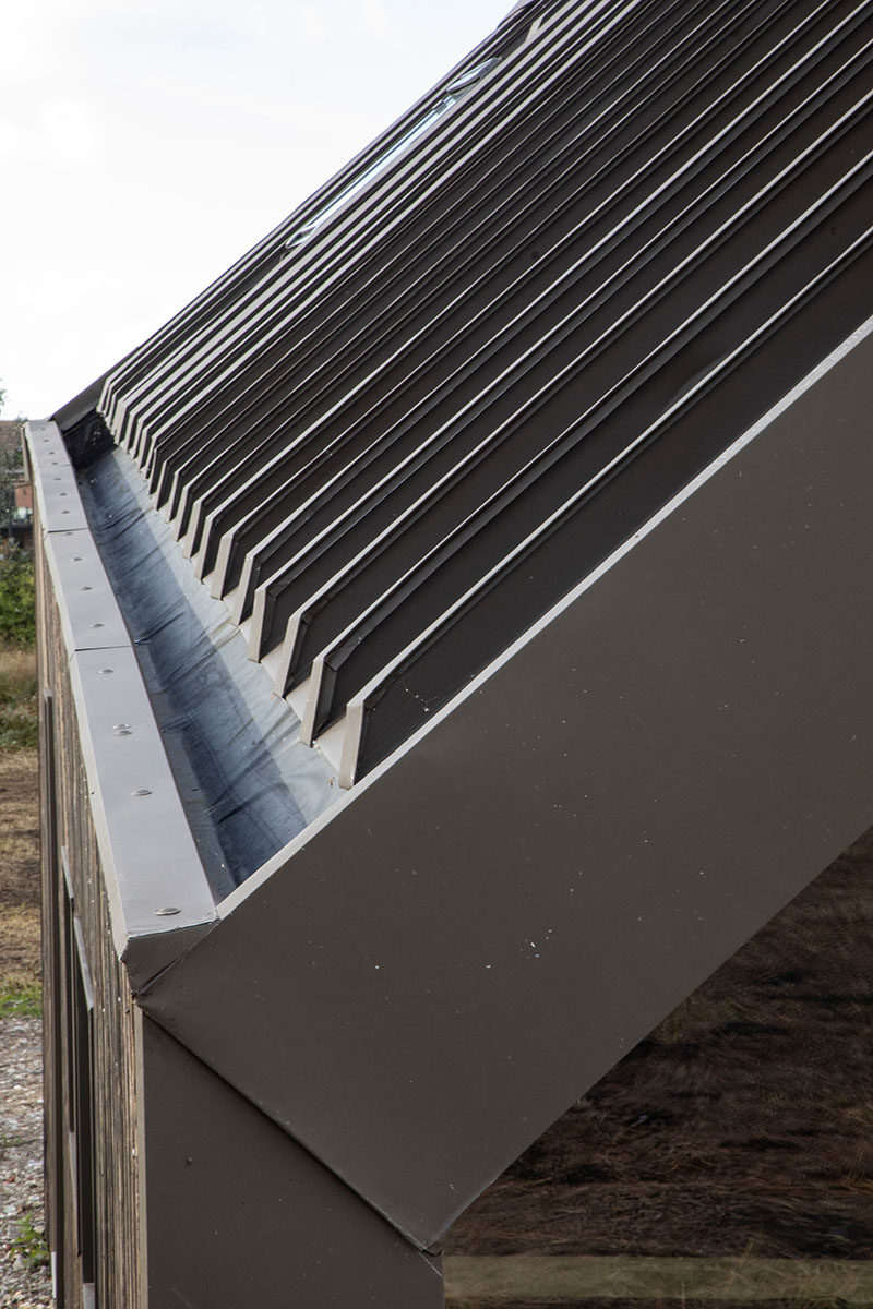 Per il rivestimento della copertura è stato utilizzato l’alluminio preverniciato Prefa colore Marrone P10 posato su moduli con giunzioni a listello (listelli con sezione 80×80 mm). L’utilizzo dell’alluminio, e del metallo in generale, come materiale di copertura è una soluzione molto comune nel Nord Europa, e i colori e le finiture sono state scelte condivise tra committenza e progettisti.