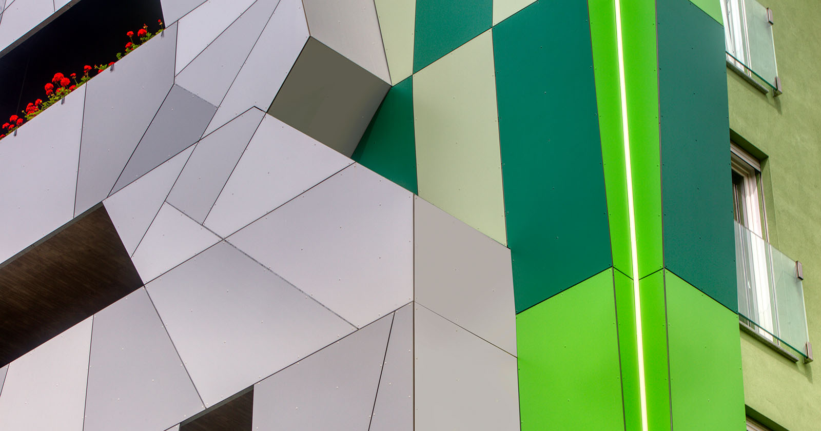 Per assecondare l‘idea di fronti “mossi dal vento” dell’artista è stato realizzato un rivestimento inclinato in modo irregolare, secondo i disegni di Ugo Nespolo, utilizzando i pannelli cromatici HPL Trespa® Meteon® fissati a una struttura metallica tramite rivetti.