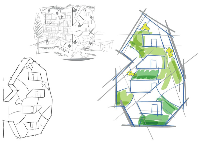 I fronti sono stati progettati con la tecnologia della facciata ventilata che ha permesso di unire una soluzione efficiente per l’isolamento termo-acustico delle residenze a una certa libertà formale nel posizionamento dei pannelli di finitura.