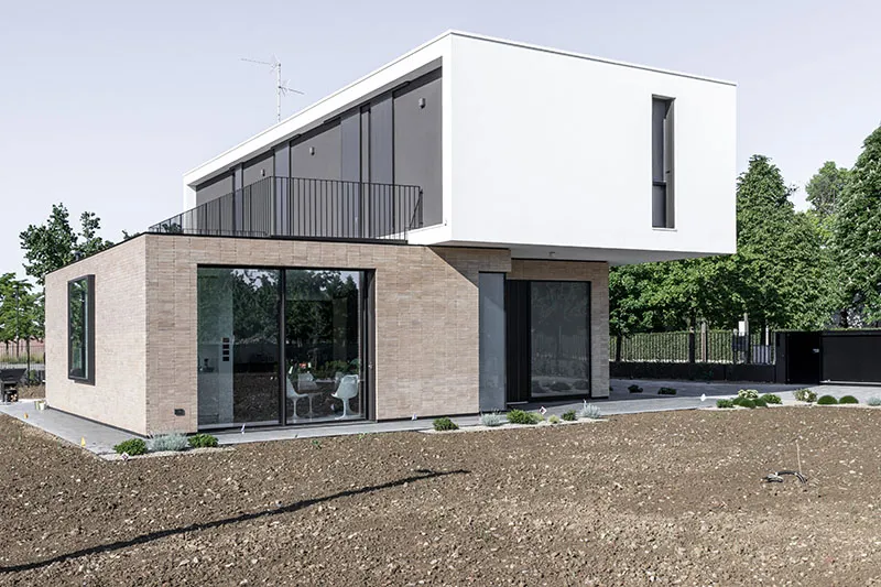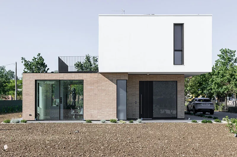 Sopra il basamento è poi appoggiato un secondo elemento geometrico, un volume regolare che ospita invece la zona notte dell’abitazione. Questo parallelepipedo, sovrapposto al precedente in laterizio, attraverso alcune parti a sbalzo crea logge utili a definire la zona d’accesso e l’eventuale realizzazione di un posto auto esterno coperto in aggiunta ai due del garage interno. Ma anche un gioco di terrazzi esterni, estensioni degli ambienti notte delimitati da un parapetto metallico di colore nero. Rispetto al piano terra, questo differisce per le finiture intonacate chiare e gli scuri in alluminio a filo esterno che scorrono su una parete leggermente arretrata del medesimo colore, utile a evidenziare la stereometria del corpo del primo piano.