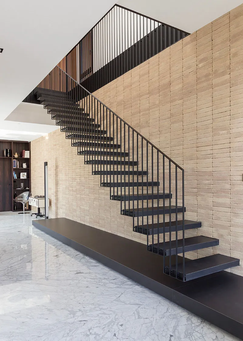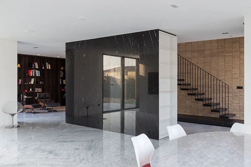 I materiali, lo sappiamo, possono fare una differenza enorme nella riuscita di un progetto di architettura. Ne è esempio la parete in faccia a vista dell’esterno, posata per file di elementi paralleli e senza giunti, che si è scelto di far continuare internamente nella zona di ingresso, a nobilitare il muro dove si trova la scala metallica a sbalzo, illuminata dai lucernari. L’open space del piano terra è caratterizzato da un gioco cromatico lucido positivo/negativo, di chiaroscuri e dettagli d’accento: il pavimento è in marmo di Carrara a macchia aperta, la parete della zona soggiorno in nero Marquinia. Una libreria in ebano funge da quinta e filtro tra lo spazio living e la zona più tecnica del piano terra. La zona notte è caratterizzata da un pavimento in teak posato con spina alla francese, materiale utilizzato anche per le boiserie che contengono le porte a tutta altezza degli ambienti e dei vani ripostiglio fruibili dallo spazio distributivo.