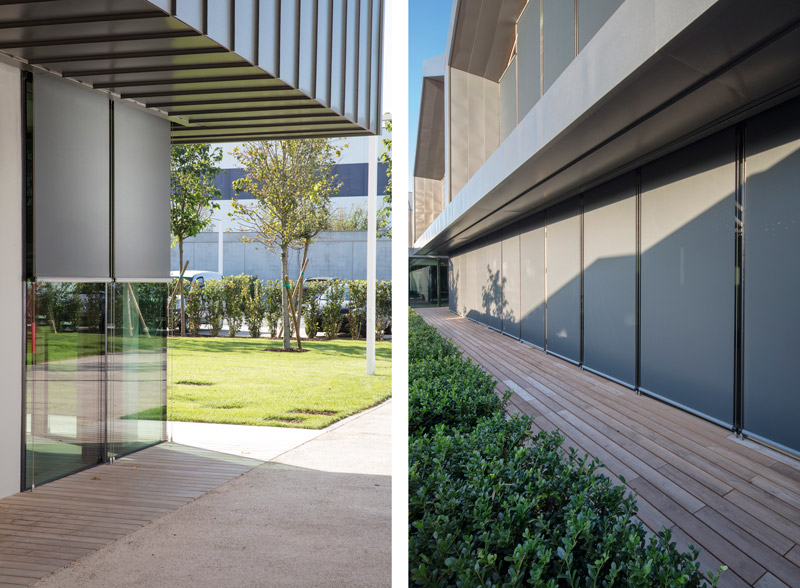 - Uffici al primo piano: sette tende a rullo Boston CT135, larghe 130 cm e con un’altezza piramidale che va da 360 cm fino alla massima di 600 cm. Ogni modulo è movimentato a motore dal basso verso l’alto tramite il Traction kit, un dispositivo di trazione forzata ideato appositamente per sistemi da esterno allo scopo di attribuire un’efficace tensione al telo in applicazioni verticali, oblique e orizzontali.