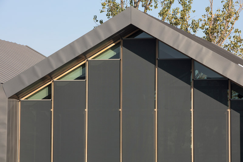 Resstende, azienda specializzata nella progettazione di dispositivi di protezione solare, che vanta tra le sue ultime realizzazioni la Feltrinelli Porta Volta a Milano di Herzog & de Meuron, ha fornito per la nuova sede Davines un sistema di schermatura solare a rullo automatizzata che fa in modo che sia il sole stesso ad attivare il meccanismo di salita o discesa degli elementi.
