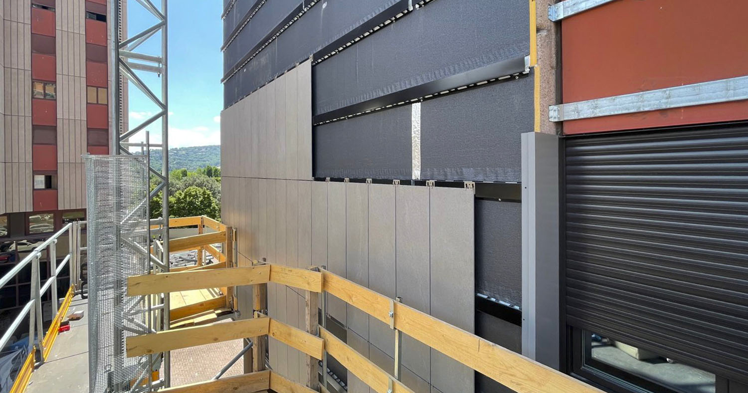 La scelta del sistema isolante è ricaduta sul sistema Isotec di Brianza Plastica e, in ragione dell’altezza di 12 piani dei due palazzi, gli ingegneri Marco Balducci e Roberto Regni di Area Progetto Associati hanno optato, in particolare, per il sistema Isotec Parete Black, con anima isolante in poliuretano espanso rigido (PIR) autoestinguente e rivestimento in estradosso in coating minerale ignifugo. Il pannello, dal caratteristico colore antracite, si caratterizza per le migliorate prestazioni di reazione al fuoco (classe B-s2, d0).