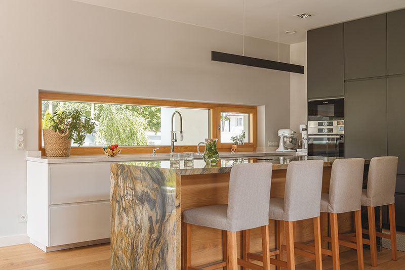 Mentre le finestre, in configurazione FIX + RU (vetrata fissa + apertura anta-ribalta ovvero una finestra non apribile e una piccola finestra ad anta ribalta), forniscono abbondante luce naturale e aerazione: una soluzione che permette di illuminare la cucina riducendo al minimo l’apertura dell’anta e ampliando l’area di lavoro, senza compromettere privacy e ingresso della luce.