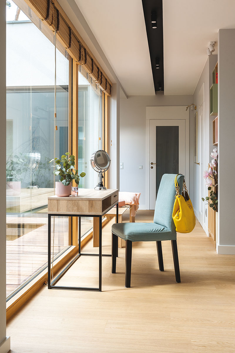 È proprio il design delle superfici vetrate a favorire ed esaltare questo rapporto fra il dentro e il fuori: le finestre verticali FAKRO INNOVIEW riescono a creare, infatti, una strettissima continuità, un gioco di rimandi materici e cromatici tra il parquet, le doghe di legno dei percorsi esterni e la vegetazione.