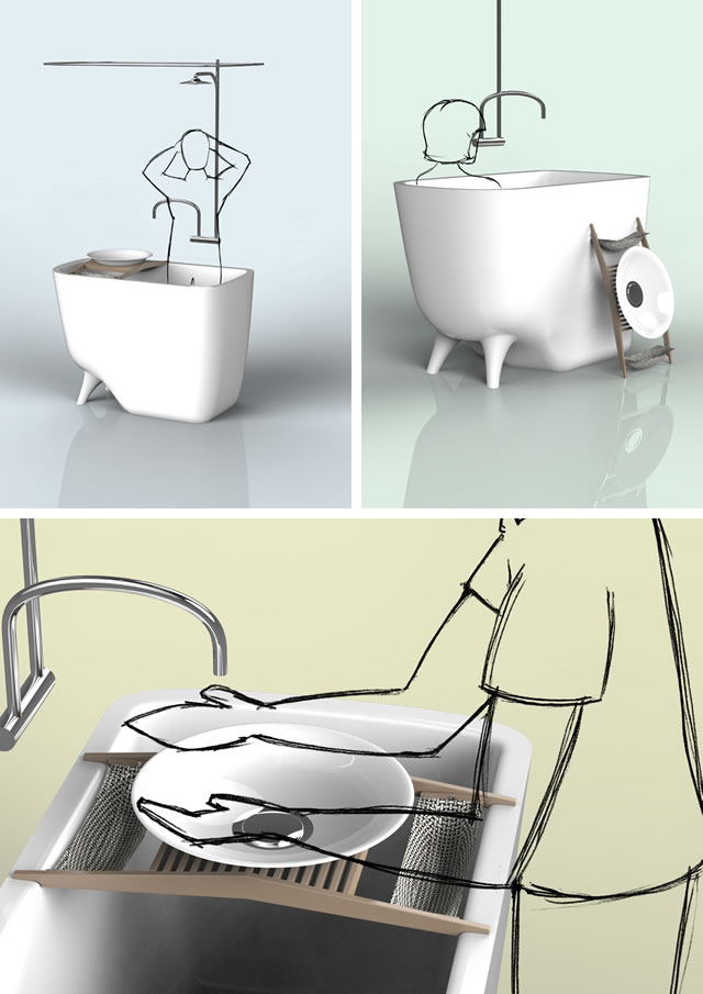 Il ‘magico‘ sanitario raggruppa tre funzioni: lavabo, doccia e vasca. Materiali e design a basso impatto per un’efficienza a tutto tondo ideale per i mini appartamenti, anche in termini di salva-spazio!
