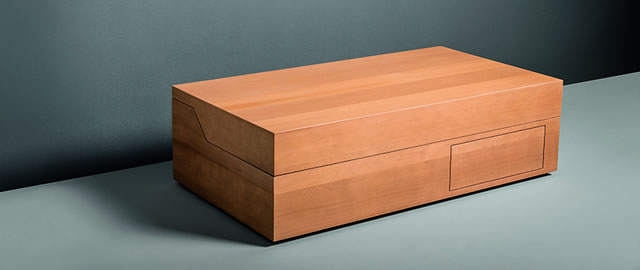 Riposizionato il coperchio, Hidden diventa un’affascinante e rigoroso volume in legno, di elegante e nuda essenzialità, elemento originale, scenografico e contemporaneamente funzionale.