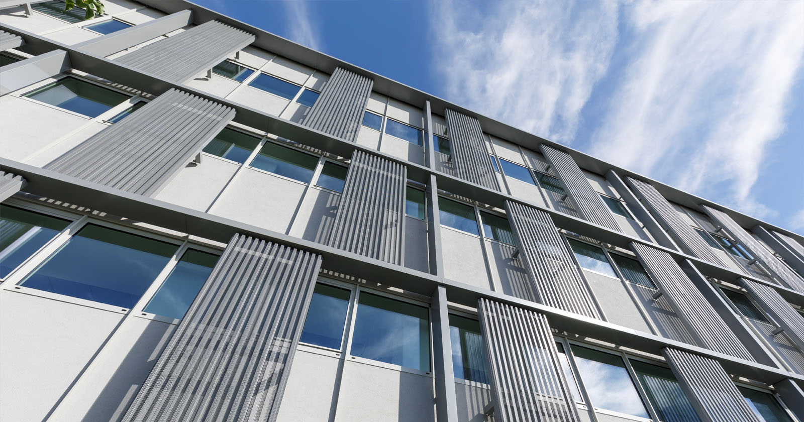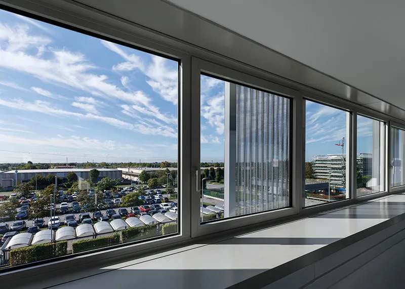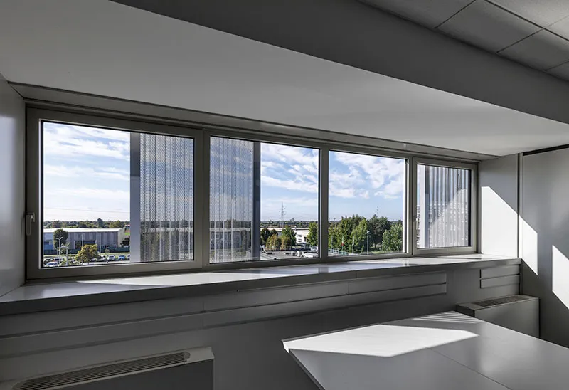 Le grandi porzioni vetrate orizzontali continue sulla facciata principale sono realizzate con i vetri a controllo solare COOL-LITE® SKN 176 ORAÉ® e parzialmente oscurate da eleganti strutture frangisole in lamiera di alluminio.