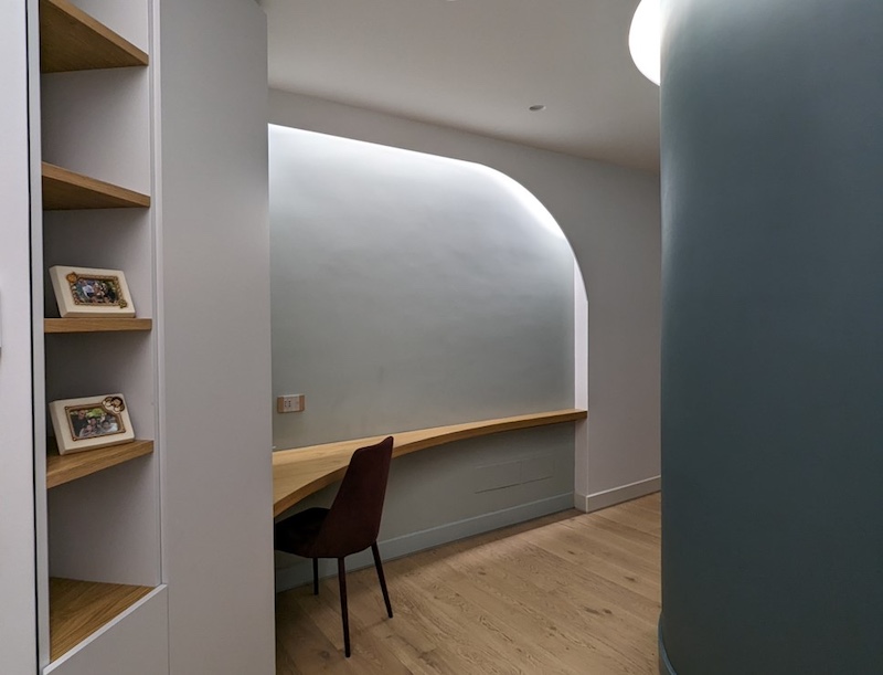 Questa parete sinuosa è un volume verde petrolio (NT-2036) dal grande impatto visivo che, con l’assenza di angoli retti, invita alla condivisione e alla convivialità. Ad esaltarne il ruolo da protagonista contribuisce la scelta cromatica a contrasto delle restanti pareti del salotto, trattate con sabbia (GR-0111), un colore caldo, luminoso e delicato che armonizza l’insieme.