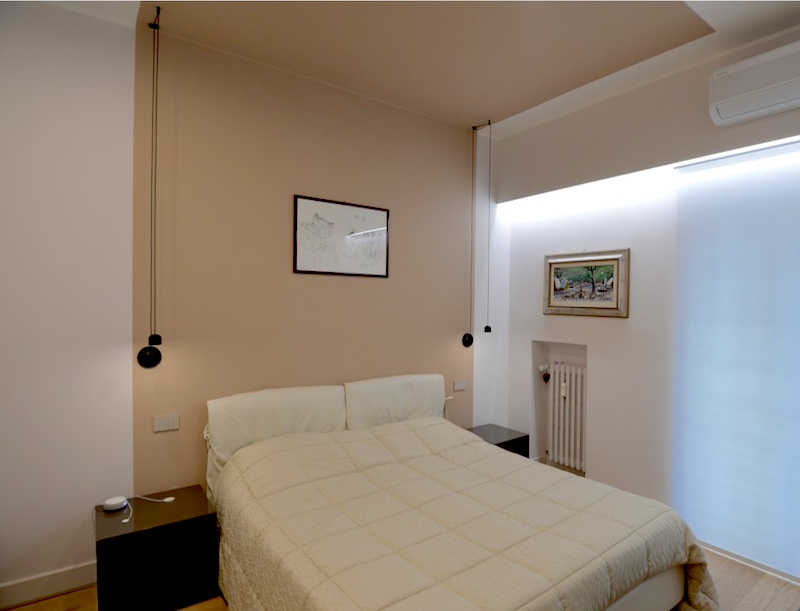 Nella zona notte ogni camera è stata caratterizzata in base alla personalità del componente della famiglia che la abita; nella camera padronale è stato ricreato un ambiente minimale, con una luce discreta e avvolgente; il letto viene evidenziato grazie al tenue color terracotta (NT-0633) che colora la parete retrostante e il soffitto creando un “effetto baldacchino”, che rimanda all’idea di un rifugio accogliente e riposante.