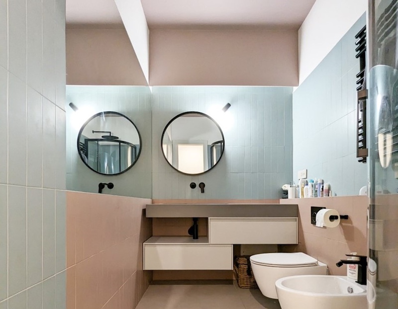 Il bagno trova invece il giusto compromesso nel match bilanciato di mattonelle rosa e celesti, il soffitto in questo ambiente abbandona il bianco per arricchirsi di colore (ME-0141), diventando anch’esso un elemento decorativo inaspettato e di impatto.