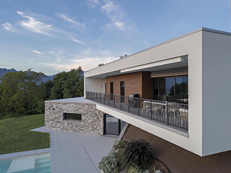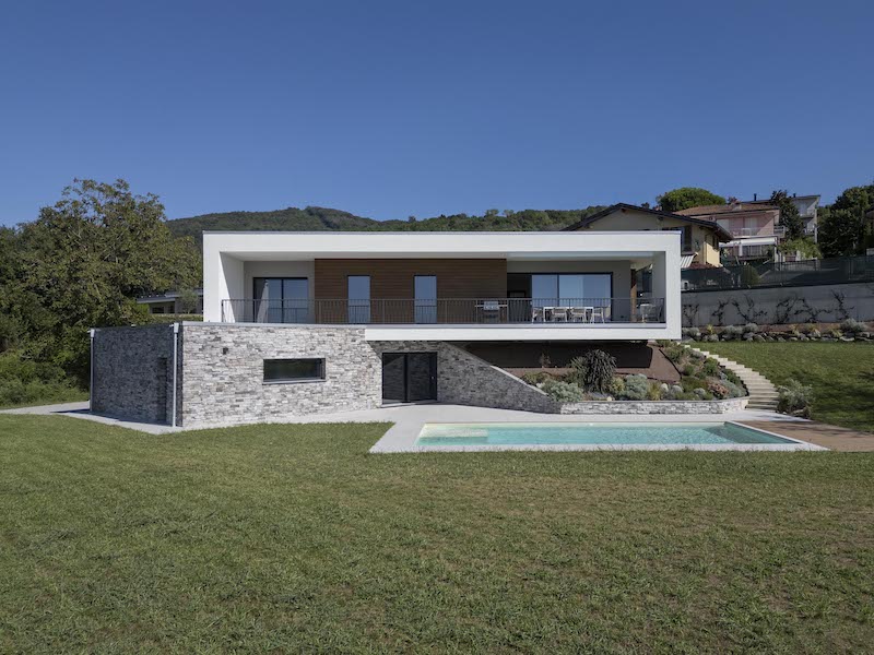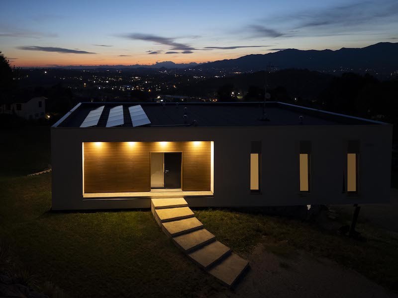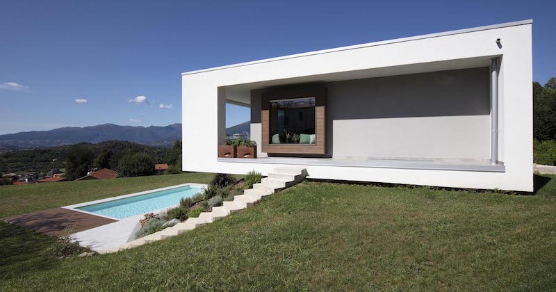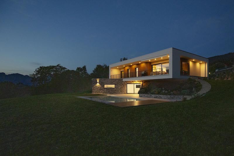 Ma torniamo in Italia, dove l’Ing. Jhon David Sgotti ha progettato una casa unifamiliare che porta avanti questa ricerca su continuità visiva e spaziale, insieme al rapporto con il paesaggio, aggiungendo la quota sostenibilità. La villa infatti è stata realizzata in legno prefabbricato da Marlegno, azienda bergamasca specializzata nella progettazione e costruzione di edifici in bioedilizia.