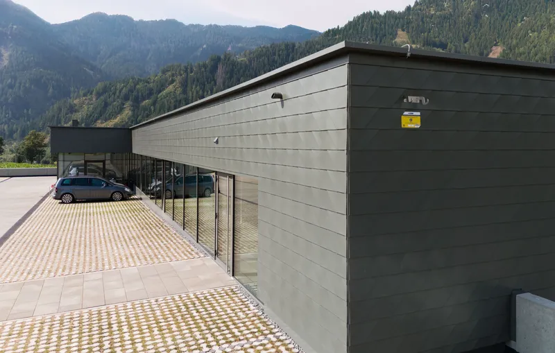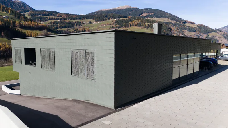 Le facciate sono rivestite in RHEINZINK Prepatina, una lamiera di zinco titanio che crea l’effetto di una pelle squamosa e si abbina cromaticamente al porfido di Sarentino. La superficie pre-invecchiata si armonizza con la pietra, sviluppa una patina naturale e garantisce la durabilità dei fronti. Le specchiature vetrate creano interessanti giochi di luce all’interno, secondo l’ora del giorno e il tempo atmosferico, e sono protette da persiane mobili con chiusura a libro che conferiscono ritmo alle superfici.
