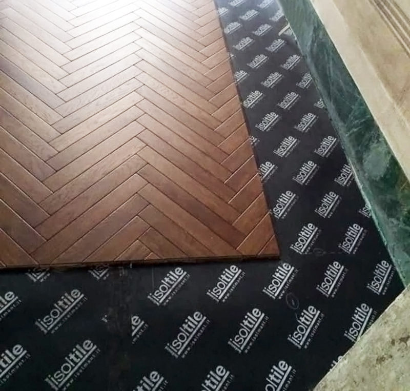 Lo strato acustico IsolTile, con la sua elevata tecnologia racchiusa in soli due 2 millimetri di spessore, ha permesso di realizzare una posa semi-flottante della pavimentazione a regola d’arte, garantendo il corretto comfort acustico, oltre che un’elevata protezione dall’umidità grazie alla presenza della barriera al vapore integrata.