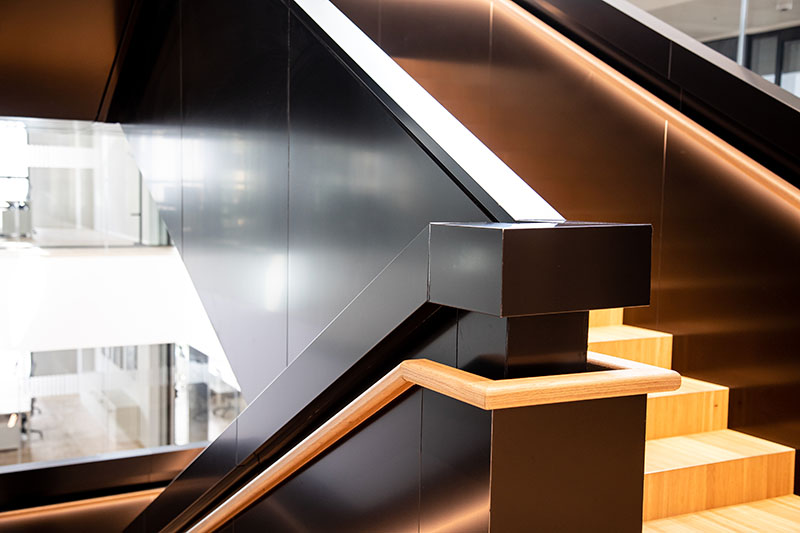 La scala centrale è il cuore funzionale e simbolico dell’intero edificio. Al centro dell’atrio, che copre una generosa doppia altezza, distribuisce in modo dinamico i percorsi orizzontali che conducono agli ambienti organizzati a pettine lungo il perimetro dell’edificio.