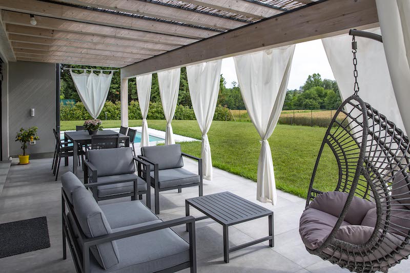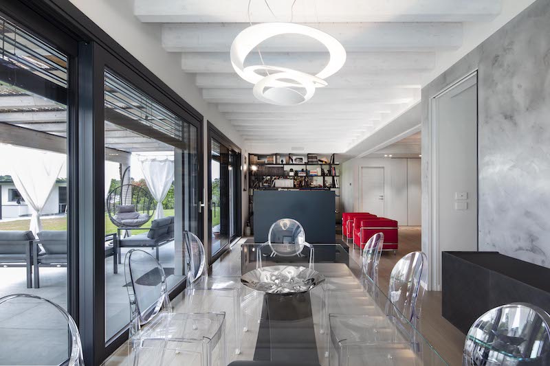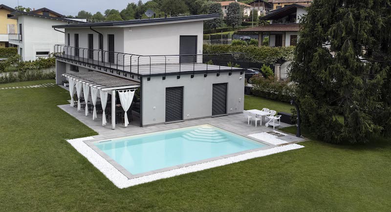 All’esterno la zona giorno trova un prolungamento naturale nella piscina e nel pergolato realizzato in legno lamellare impregnato color bianco puro, che valorizza con la sua leggerezza lo spazio esterno e crea dei piacevoli giochi di luce negli ambienti interni.
