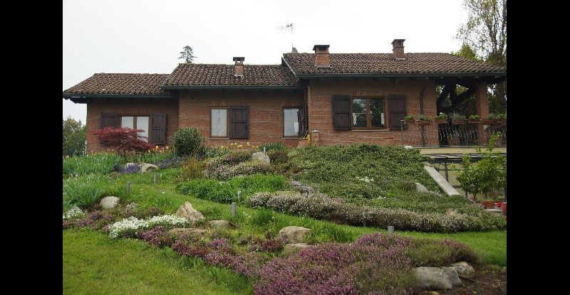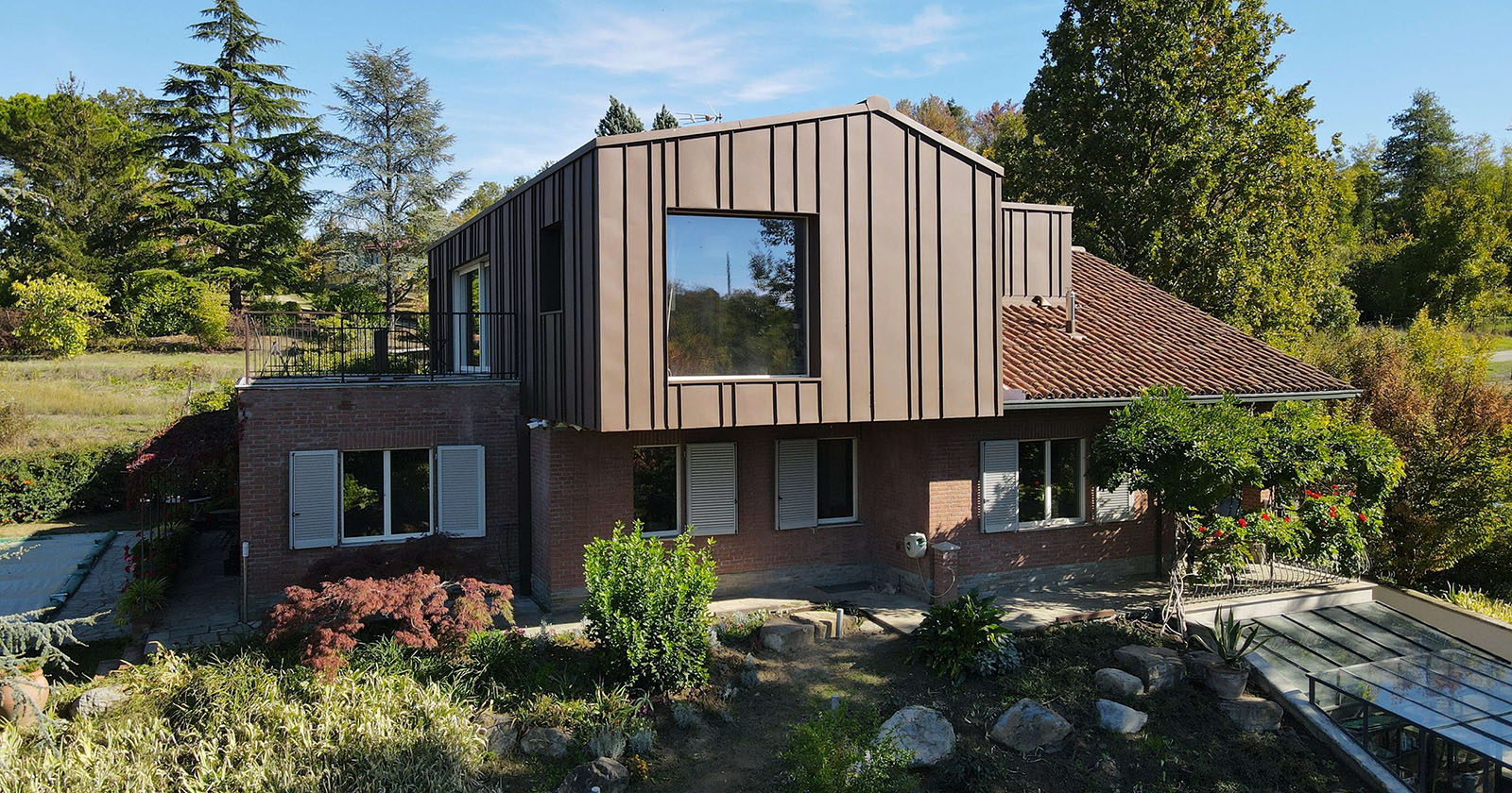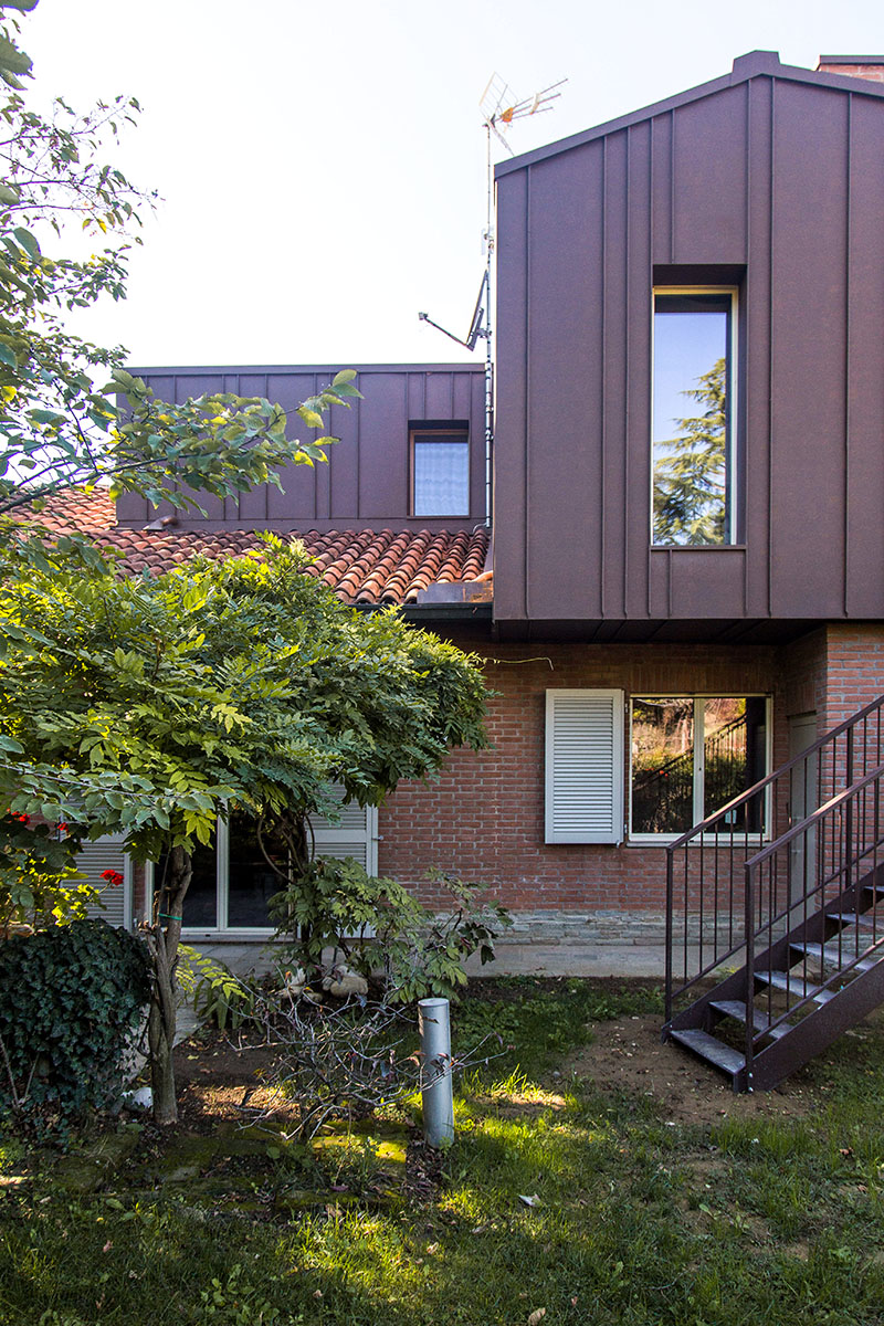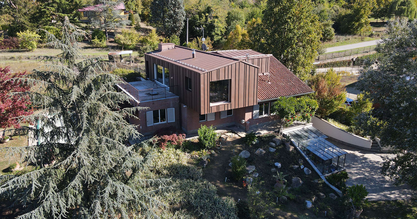 Una villa sulle pendici delle colline del Monferrato risalente alla metà degli anni ‘80 è stata oggetto di un intervento di ampliamento: al corpo di fabbrica esistente, caratterizzato da un linguaggio architettonico prettamente tradizionale, con pareti perimetrali in mattoni faccia a vista e manto di copertura in coppi, è stato aggiunto un volume sopraelevato rivestito in lamiera aggraffata, che reinterpreta in chiave moderna le finiture originarie.