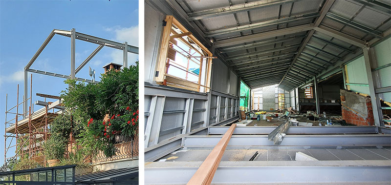 Per realizzare la sopraelevazione, gli ingegneri strutturali hanno scelto di operare totalmente a secco, partendo da una struttura in acciaio. Dopo la rimozione di una porzione di copertura esistente, è stato realizzato lo scheletro dell’ampliamento, utilizzando un’orditura primaria in travi IPE e HEA.