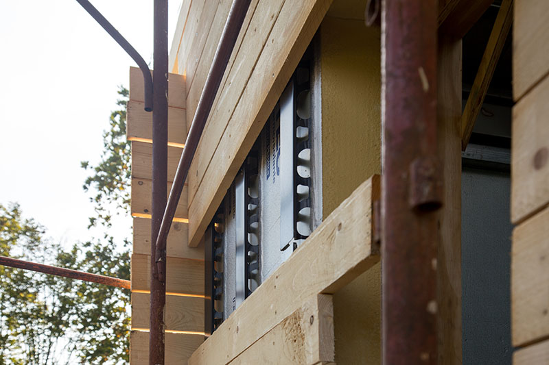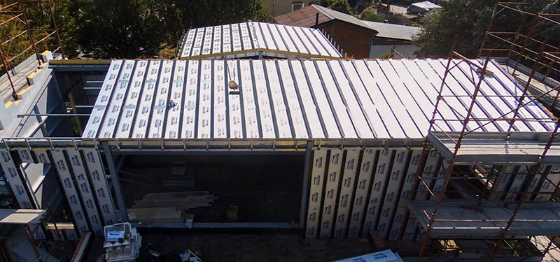 In questo caso, ai correntini scelti nella variante nera è stato fissato tramite viti autoperforanti, un tavolato in legno di abete (sp. 3 cm), per creare un piano continuo per il fissaggio del rivestimento metallico in alluminio aggraffato esterno.