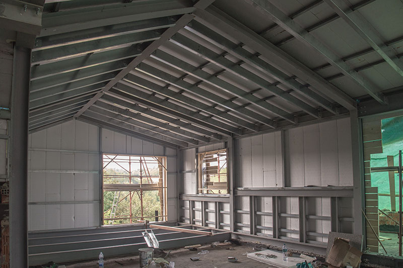 La struttura primaria è stata integrata con ulteriori montanti e traversi, posati con interasse di circa 60 cm, che hanno consentito la successiva installazione, sul lato esterno e tramite ancoraggio meccanico, dei pannelli Isotec Parete di spessore 120 mm e passo 400 mm, sia in parete che in copertura.