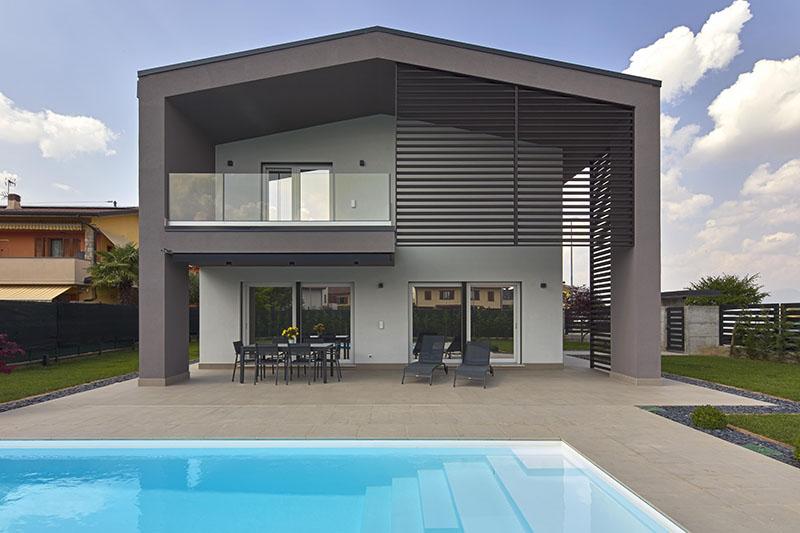 Il risultato è un’abitazione che all’esterno è rigorosa ed elegante con forme geometriche che riprendono le soluzioni presenti nell’intorno, riproponendo l’utilizzo di un tetto a due falde ma con l’inserimento di elementi architettonici che la caratterizzano: l’utilizzo dei canali di gronda integrati nella struttura, l’importante aggetto del balcone sorretto da una trave a sbalzo che attraversa il soggiorno, l’inserimento del grande frangisole fisso, i parapetti in vetro. Anche per la scelta delle cromie c’è stato un lavoro lungo e parsimonioso fino ad arrivare ad un grigio scuro e un bianco puro in continuità con gli infissi.