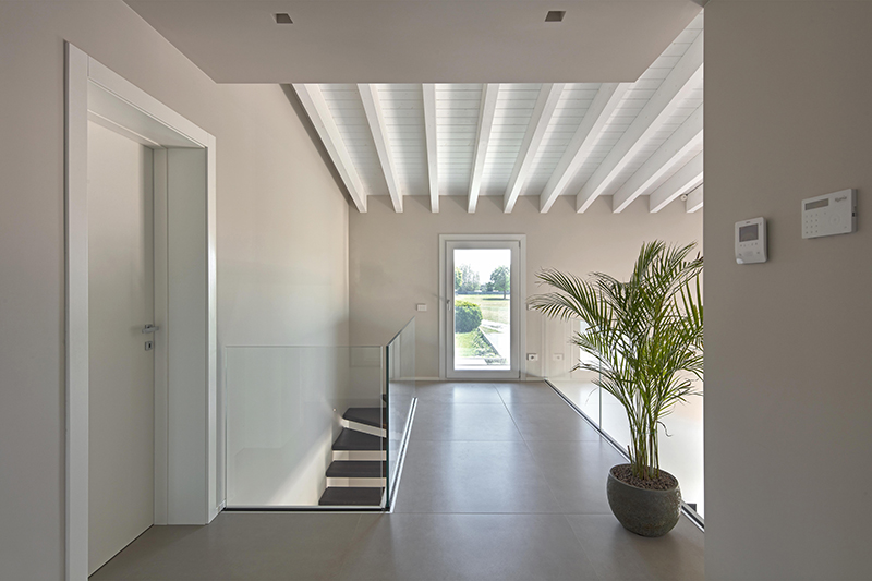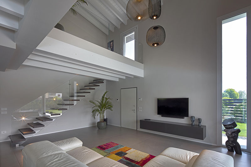 All’interno lo spazio è molto luminoso, dominato dal soggiorno a doppia altezza, con soppalco al quale si accede tramite una scala con gradini a sbalzo e parapetto in vetro.